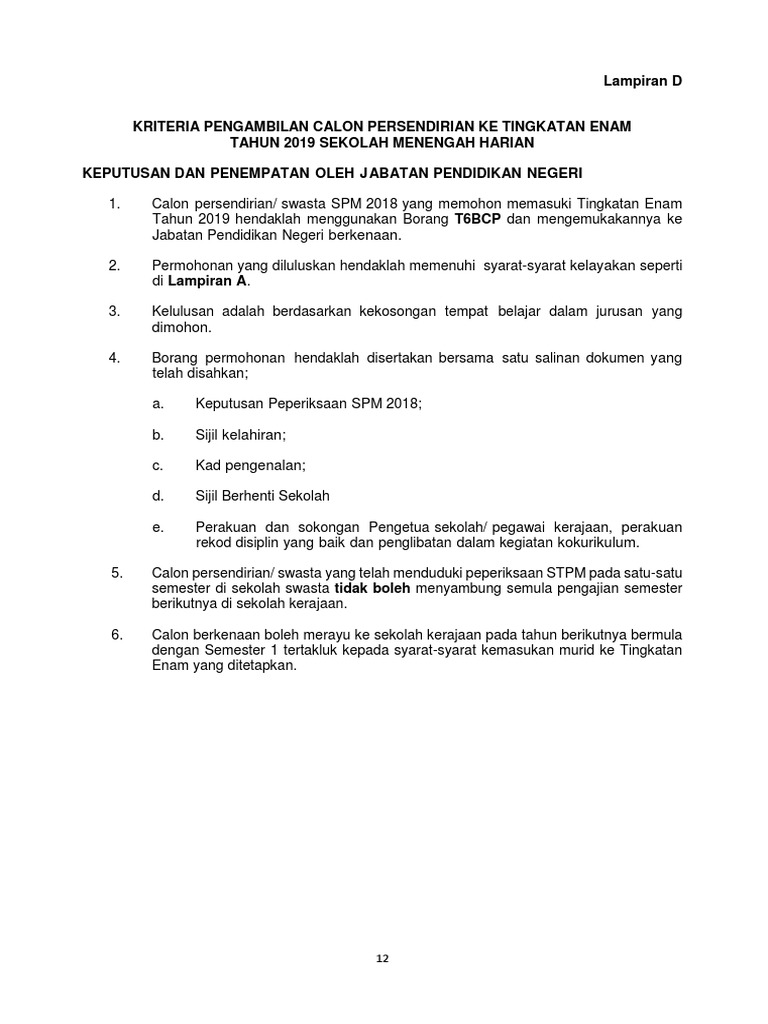Lulus dalam peperiksaan SPM 2019 dengan memperoleh pencapaian akademik yang telah ditetapkan. Borang Rayuan Kemasukan ke Tingkatan Enam T6BRU serta panduan mengisi borang boleh dimuat turun di sini. Borang T6BRU ini adalah untuk murid membuat rayuan memasuki Tingkatan Enam Tahun 2017 kecuali Sekolah Menengah Pendidikan Khas SMPK dan Program Pendidikan Khas Integrasi PPKI.