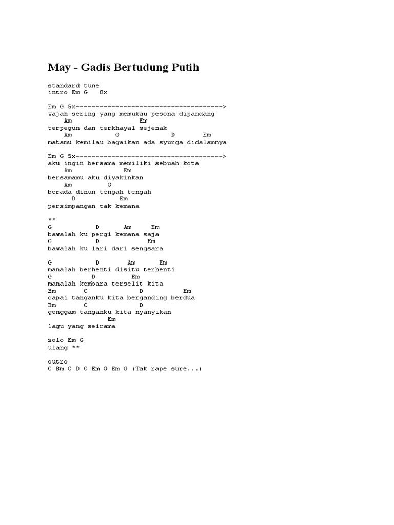 Jika ada sebarang masalah tentang chord lagu diatas sila buat aduan pada Form Report Chord yang disediakan. Guitar Pro May. Lirik Gadis Bertudung Putih.
